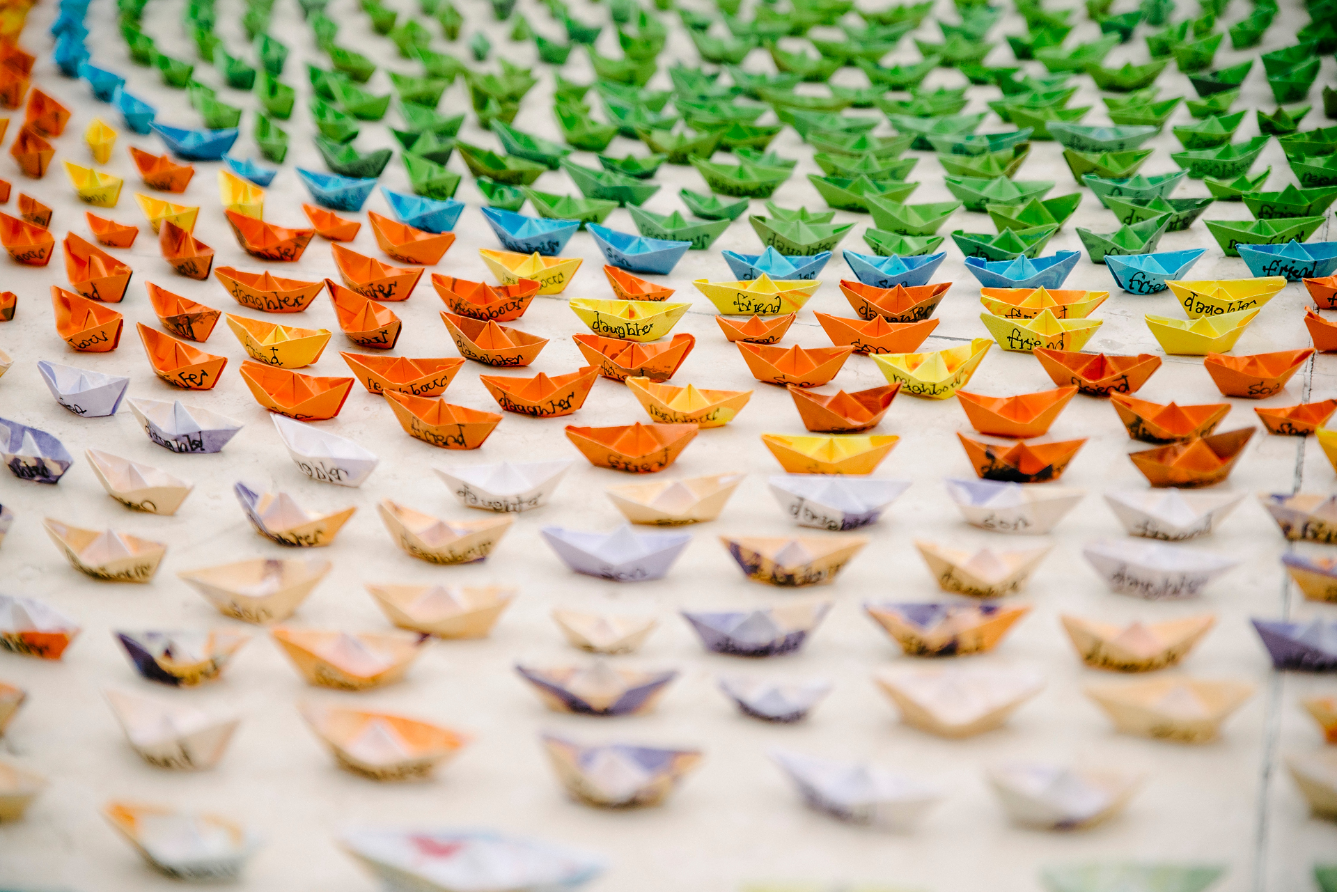 Bern describes the almost solitary production of the tiny boats in her kitchen as a powerless and repetitive endeavour which bears witness to the huge loss of life along the Libya/Italy and Greece/Turkey migratory routes. Paper is water-marbled, dried, torn, folded and turned into a boat, each representing a person recorded by the Missing Migrants Project as drowned or disappeared in the Mediterranean Sea whilst attempting to reach Europe. She writes the words ‘son’, ‘daughter’, neighbour’ or ‘friend’ upon each one, building month by month a colour coded reminder of the similarities we share with people forced to leave their homes.