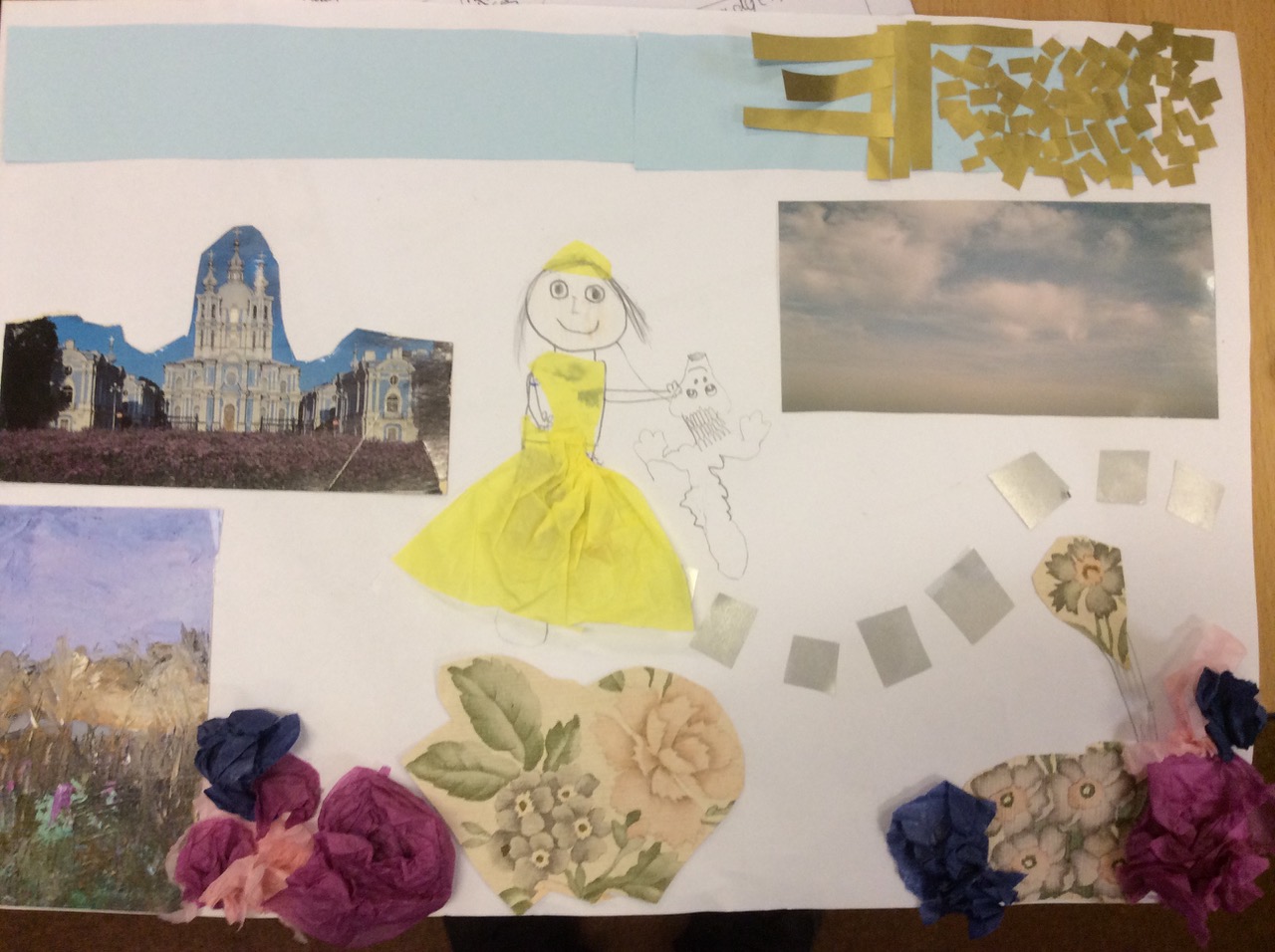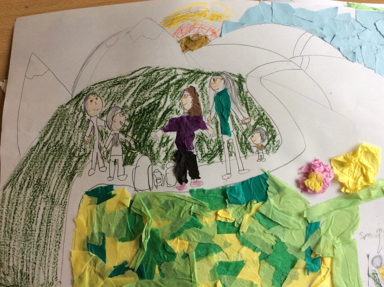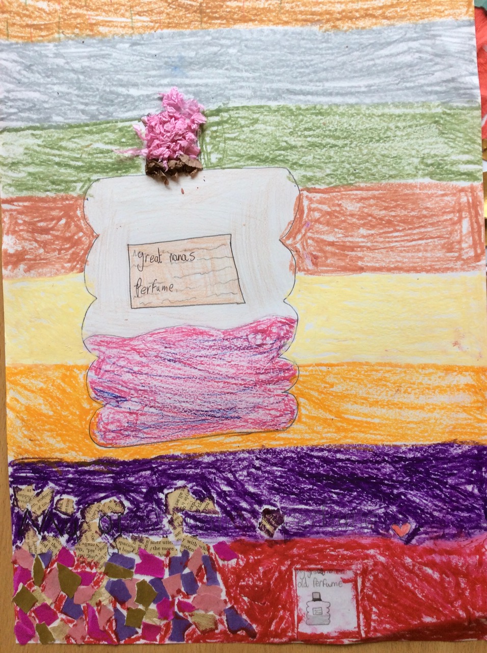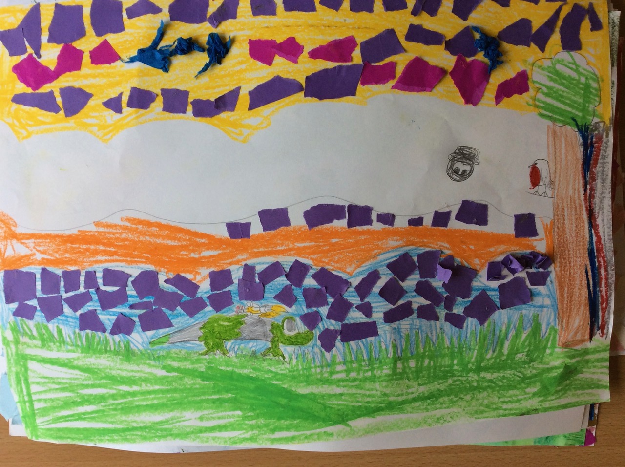The children then began work on their own picture showing their journey/item. They used materials from the school as well as various collage items brought in by Sula. She moved through the class guiding and encouraging individuals on each of their journeys as they worked.