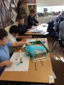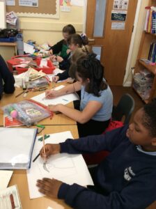 The workshops were for two classes of 30 children. Each class worked with the artist or the poet and then swapped. The school has children from a variety of backgrounds including Bangladesh, Afghanistan and Bulgaria.