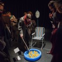 Their piece, Trigger Warning, based on the anxieties around post-Brexit Britain, breaks down stereotypes about Eastern Europeans in the media and in political discourse by placing them into the light-hearted environment of popular games. So there’s ‘Snatch a Job’, which is all about hooking a rubber duck out of a gummy pond, the Wheel of Benefits, and attempting to get an EU passport by chucking five teabags into a tea pot from some two-metre distance – a feat, which, having attempted it, I must say is not an easy one. I say this to them; the games are not easy! ’That’s the whole point,’ say Dana and Bojana, ‘all this stuff they say comes easy to Eastern Europeans isn’t easy at all. It has nothing to do with the reality in which we live.’ But why games?, I ask. ‘Well, the idea of being identified as an Eastern European and having all these characteristics and intentions stuck on to you by the media, is like adopting a role. And when we play games we take on a role, so it seemed like a natural way to go about exploring these stereotypes. Also games are all about being welcome to participate, and suddenly, after Brexit, we don’t feel so welcome anymore.